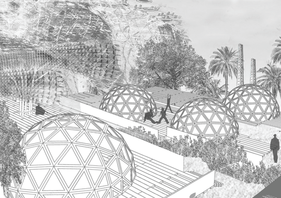 This project was design during a student exchange in Madrid, Spain (ETSAM). It consists of a community that uses the materials provide to make domes for housing, and convert the actual structures in commerce, orchards and gardens obtaining a self sustainable village. The community recycles everything available, collects the water and moves it through the place for reuse. The project was design in 2015 in collaboration with Alba Sánchez Álvarez and under the supervision of Professors Eva Gil, Federico Soriano & Pedro Urzais in “Atlas: Emulations Of The Informal IV”.